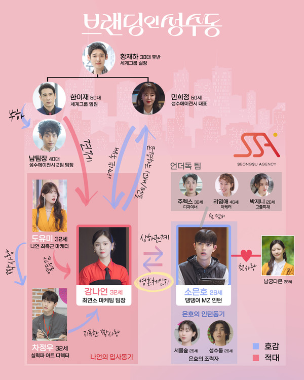 성수 에이전시 일원 중에는 이름부터 기가 막힌 성수동(김영재 분), 서울숲(연지현 분)도 있어 시선을 강탈한다. 매력 넘치는 다양한 인물들이 함께 그려갈 성수 에이전시 오피스 라이프에 예비 시청자들의 관심이 모인다.