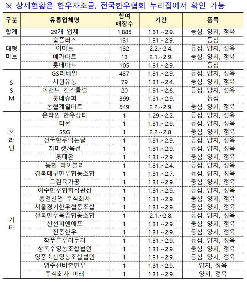 농림축산식품부는 전국한우협회·한우자조금·농협경제지주 등과 협력해 29일부터 다음 달 9일까지 12일간 전국 온·오프라인 업체 29곳, 매장 1885곳에서 전국 단위 한우 할인판매 행사를 실시한다고 밝혔다.