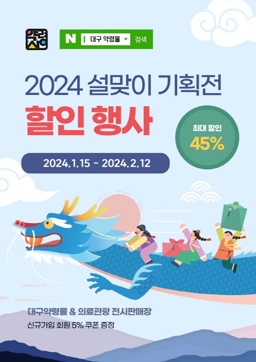 대구광역시는 설 명절을 맞아 의료관광 전시판매장과 온라인 쇼핑몰인 대구약령몰에서 ‘설맞이 기획전’을 2월 12일(월)까지 진행한다. 이번 행사는 최대 45%의 할인 혜택을 제공하며, 모든 제품을 구매금액과 상관없이 무료로 배송한다.