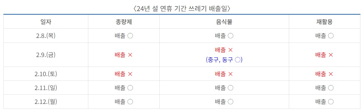 특히 이번에는 설 연휴 총 4일 중 설 당일, 일요일은 쓰레기를 수거하지 않음에 따라 구·군에서는 배출일, 수거 일정을 조정하고 배출 가능 일자를 집중 홍보할 계획이다.