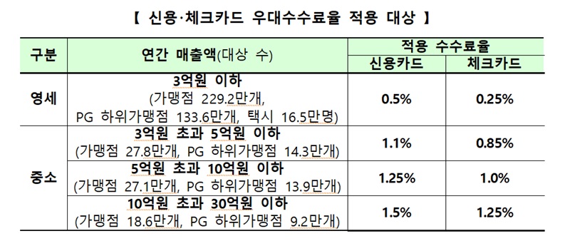 연간 매출액 3억원 이하 영세 가맹점(229만 2000개)에는 신용카드 0.5%, 체크카드 0.25%의 수수료가, 3억∼5억원 이하 가맹점(27만 8000개)에는 신용카드 1.1%, 체크카드 0.85%의 수수료가 적용된다.