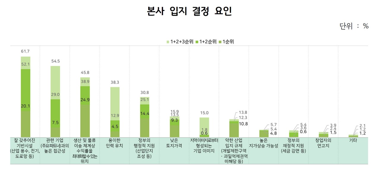 설문조사에서는 기업의 주요 시설을 본사, 생산시설(공장 등), 연구시설(연구소 등)로 구분하고 각 시설 입지를 결정할 때 중요하게 여기는 요인 최대 세 가지까지 우선순위를 매겨 답하도록 했다. 그 결과, ▲본사에 대해서는 기반시설, 관련 기업과의 접근성, 이송 체계상 수익률 극대화, 용이한 인력 유치, 정부에 의한 산업단지 조성이 주요 요인으로 나타났고 ▲생산시설에 대해서는 본사와의 접근성, 이송 체계상 수익률 극대화, 기반시설, 관련 기업과의 접근성, 정부에 의한 산업단지 조성, 용이한 인력 유치 순으로 우선순위가 달라졌으며 ▲연구시설에 대해서는 본사와의 접근성, 관련 기업과의 접근성, 기반시설, 용이한 인력 유치, 이송 체계상 수익률 극대화, 정부에 의한 산업단지 조성 순으로 비중이 높았다.