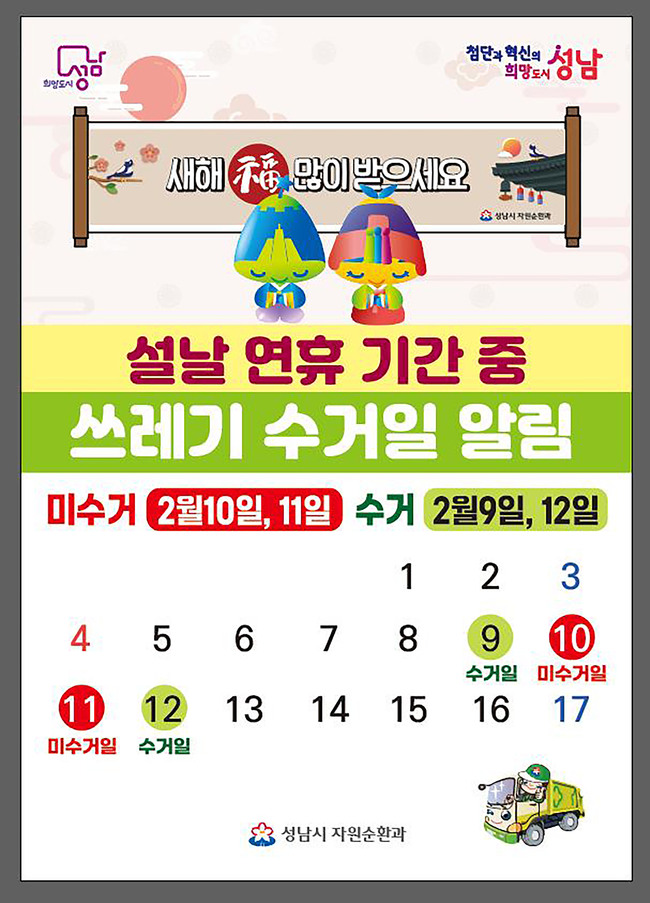 성남시 자원순환과 관계자는 “ 설 연휴 기간에도 깨끗한 지역 환경을 유지할 수 있도록 재활용품과 명절 음식물 쓰레기 감량에 적극적으로 동참해 달라 ” 고 당부했다 .