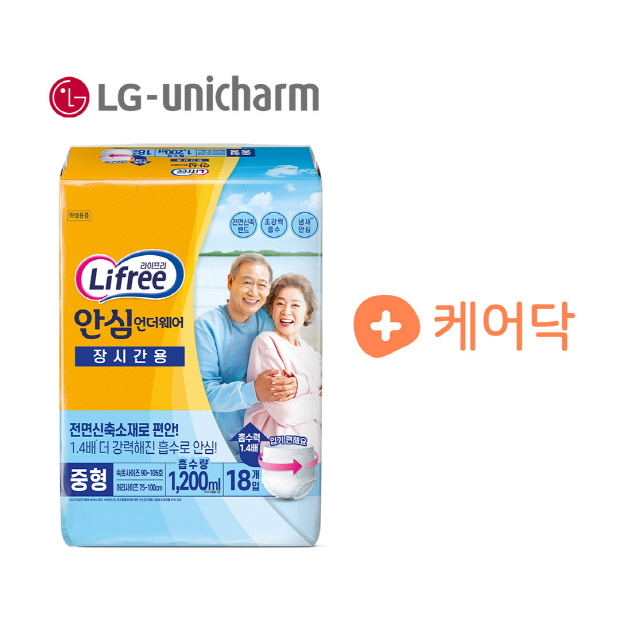 성인용 기저귀 라이프리 안심언더웨어 장시간용은 중형/대형 2종으로 구성되어 있고 1,400㎖(자사 시험법 기준) 대용량 흡수력으로 밤새 사용해도 소변이 새는 걱정을 하지 않아도 되는 제품이다. 장시간 외출하거나, 가족 또는 간병인이 자리를 비울 때, 소변 양이 유난히 많은 날 등 다양한 상황에서 유용하게 사용할 수 있다.