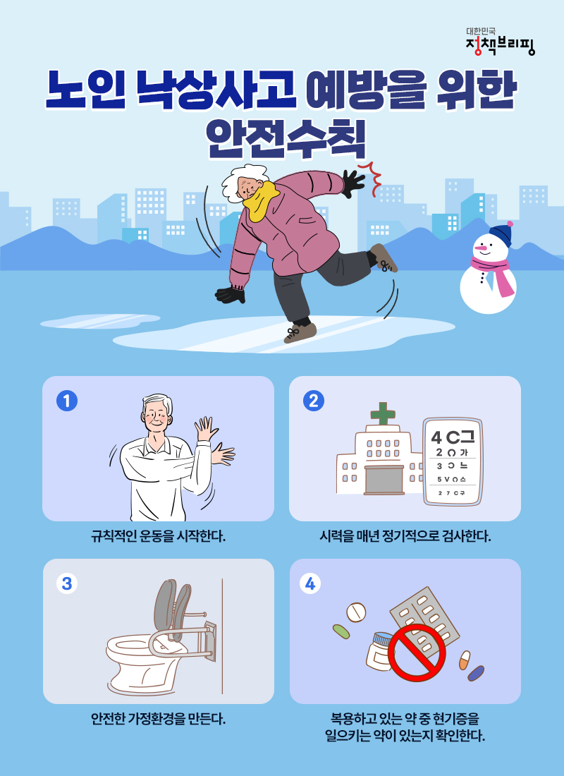 집안이나 길에서 넘어지지 않도록 주의하고, 특히 어르신들은 겨울철에 외출 시에도 각별히 조심해야 한다.