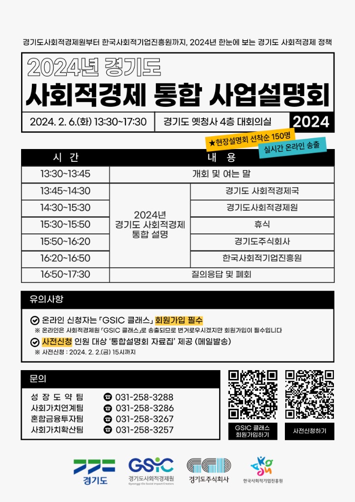 해당 설명회는 현장설명회와 온라인 송출 두 가지 방식으로 진행되며, 경기도사회적경제원 누리집(gsic.or.kr)을 통해 신청할 수 있다. 통합 설명회 자료집은 사전 신청자에 한해 제공한다.