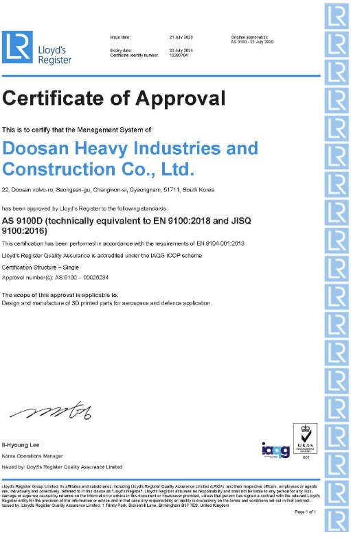 AS9100은 세계 항공우주 분야에서 요구되는 안전성, 신뢰성, 특수요건을 반영해 국제항공품질협회(IAQG)가 제정한 국제 표준 규격으로, 항공산업 진입에 필수적인 인증이다. 이번에 두산중공업이 획득한 인증의 범위는 항공,우주 및 방위산업 부문에 대한 3D 프린팅 개발 및 제조 분야다.
