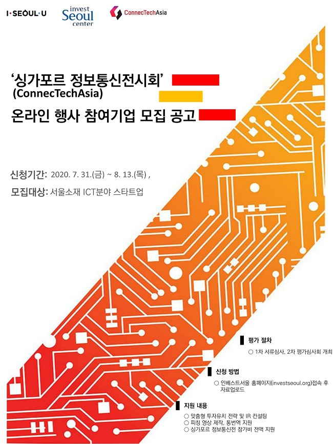 서울시는 ‘싱가포르 정보통신전시회’ 온라인 행사(9.29.~10.1.)에 참가할 혁신기술을 보유한 정보통신 분야 스타트업 20개사를 모집한다. 7월31일(금) 0시부터 8월13일(목) 18시까지 인베스트서울 홈페이지(www.investseoul.org)에서 접수 받고 서울 소재 정보통신 분야의 스타트업이라면 누구나 신청 가능하다.