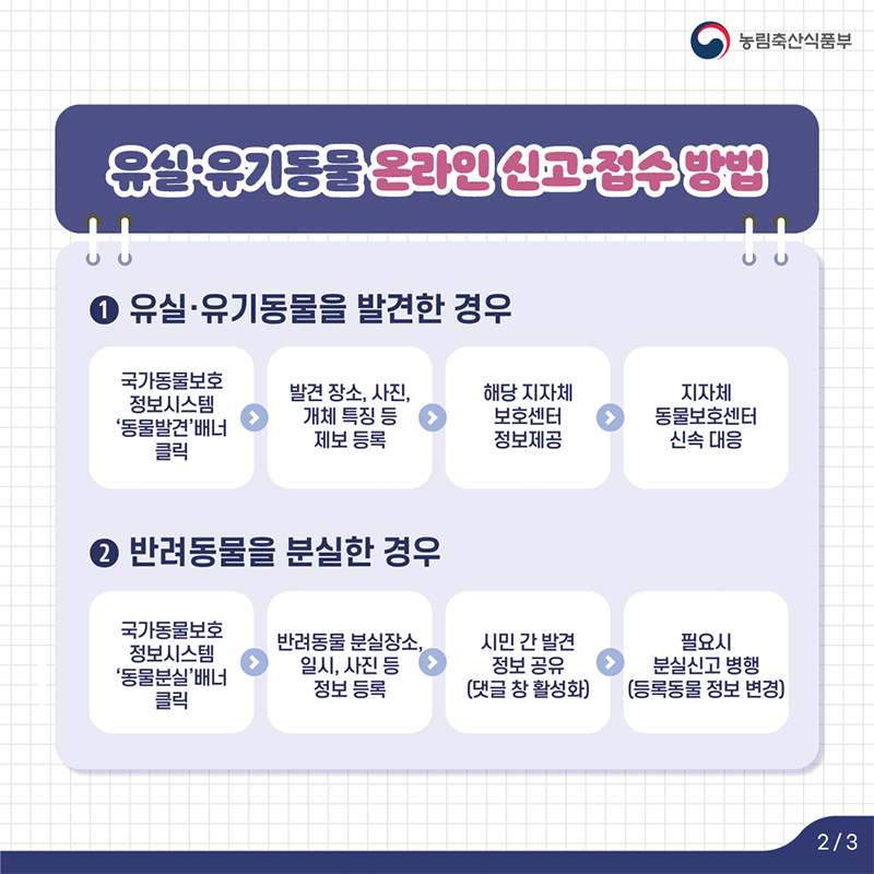 인근 지역을 떠돌아다니는 유실·유기동물을 발견하면 국가동물보호정보시스템 누리집( www.animal.go.kr )에 접속해 누리집 우측의 배너 ‘동물 발견’을 눌러 발견 장소, 동물의 종류 등을 기입해 촬영 사진과 함께 신고하면 된다.