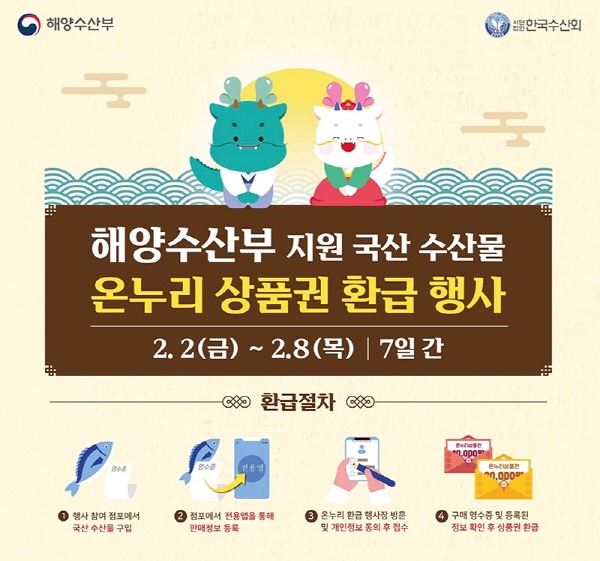 오는 2월 2일(금)부터 온누리상품권 소진 시까지 농수산물도매시장 수산시장에서 국내산 수산물, 젓갈류 등 가공식품(국내산 원물 70% 이상)을 구입하면 시장 내 환급 장소에서 당일 구매금액의 최대 30%를 온누리상품권으로 환급받을 수 있다.