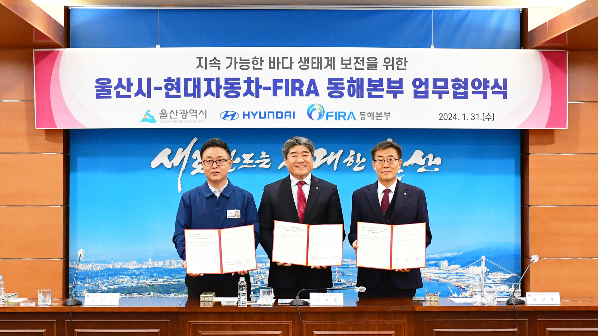 현대자동차는 31일(수) 울산시청에서 김동민 현대자동차 울산총무실장, 정호동 울산시 경제산업실장, 최성균 한국수산자원공단 동해본부장 등 주요 관계자들이 참석한 가운데 울산시, 한국수산자원공단과 ‘바다숲 조성사업 추진을 위한 업무협약(MOU)’을 체결했다.
