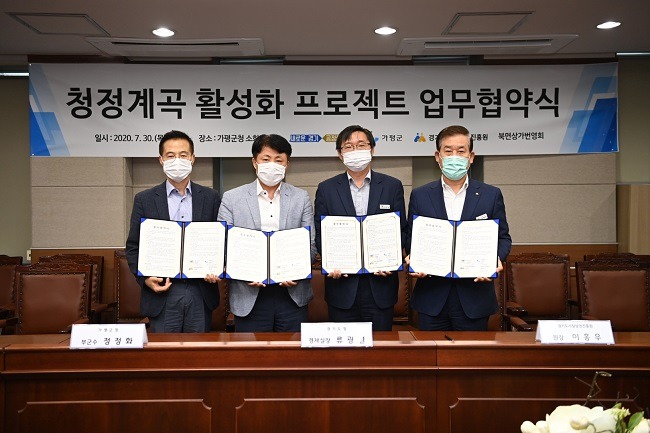경기도와 가평군, 가평군북면상가번영회, 경기도시장상권진흥원은 30일 가평군청에서 류광열 경기도 경제실장, 정정화 가평군 부군수, 이홍우 경기도시장상권진흥원장, 지역상인 등 20여명이 참석한 가운데 ‘2020 청정계곡 상권활성화 프로젝트 협약’을 체결했다.