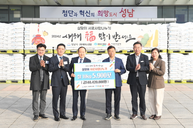 재단법인 에이스경암이 설 명절을 앞둔 2 월 1 일 성남시에 1 억 4000 만원 상당의 10 ㎏ 짜리 쌀 5900 포대를 맡겼다 .