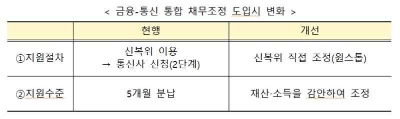 또 채무자의 재산과 소득을 감안해 채무자가 성실히 상환하고 재기할 수 있도록 금융채무와 통신 채무가 조정된다.