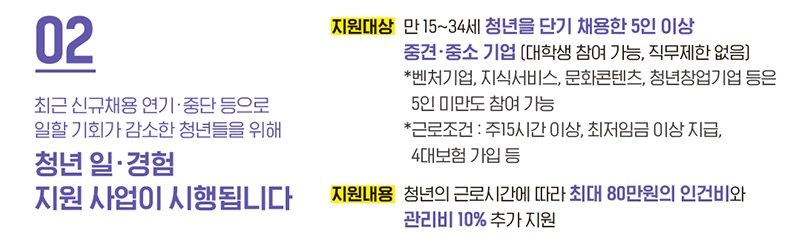 올해 최대 5만명까지 지원하는 청년 일경험 지원 사업은 청년을 단기 채용해 일경험 기회를 부여하는 기업에 월 최대 80만 원의 인건비와 관리비 10%를 지원하는 사업이다.