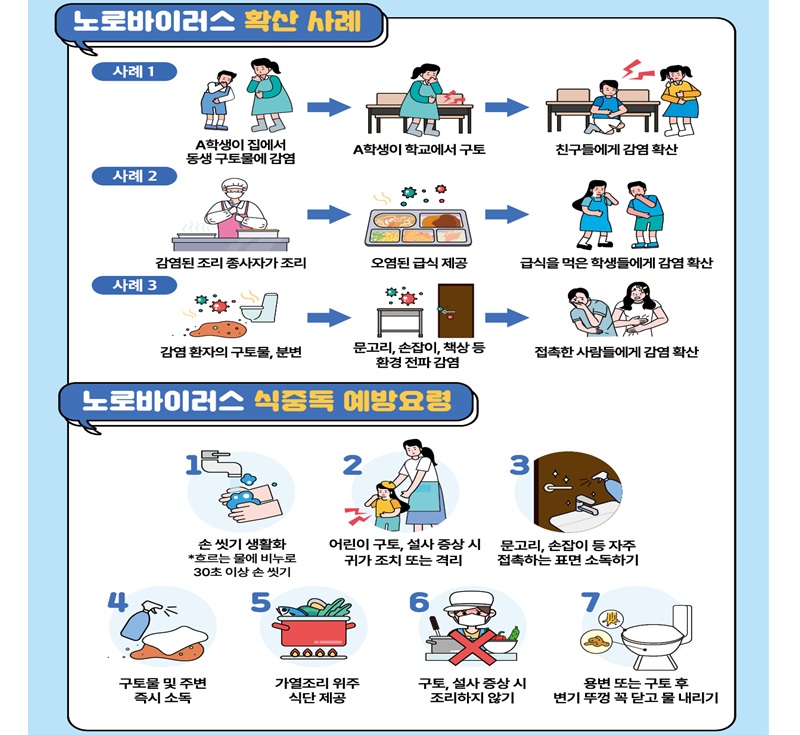 또한, 사람 간 접촉으로 전파되는 것을 예방하기 위해서는 ▲비누를 사용해 흐르는 물에 30초 이상 손씻기 ▲의심 증상 발생 때 조리 참여 금지 ▲세척·소독 등 조리 시 위생관리 등 예방수칙을 준수해야 한다.
