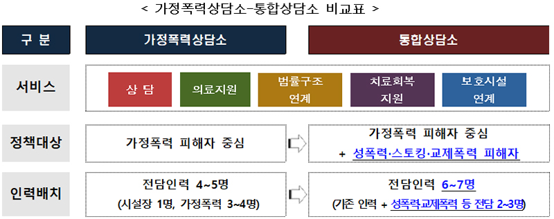 여성가족부는 폭력 피해자 보호 강화를 위해 시·군·구 등 단위에 설치된 가정폭력 상담소 26곳을 가정폭력 외 성폭력, 스토킹, 교제 폭력 등의 피해까지 지원할 수 있는 통합상담소로 확대 개편한다고 5일 밝혔다.
