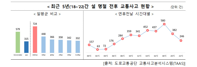 아울러 2018년부터 2022년까지 최근 5년간 설 명절 전후로 발생한 교통사고 분석에 의하면 연휴 시작 전날이 평소보다 1.3배 정도 많은 724건이 발생했고 시간대는 어두워지기 시작하는 오후 6시쯤이 가장 많은 것으로 나타났다.