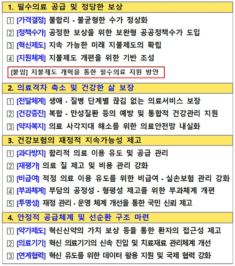 아울러 기존 급여 항목의 재평가를 주기적으로 실시해 의학적 효과나 경제성이 떨어지는 항목은 가격을 조정하거나 퇴출하는 기전을 확립한다.