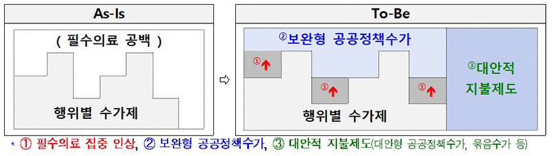 행위별 수가의 틀을 넘어 진료량보다는 의료의 질·성과 달성에 따라 차등 보상을 제공하는 대안적 지불제도 도입을 추진한다.