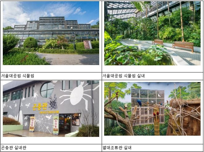서울대공원은 사회적 거리두기 1단계 전환 이후 수도권 방역 조치 강화 조정에 따라 그동안 코로나19로 인해 휴관했었던 식물원과 실내 동물사를 8월 1일부터 제한적으로 운영을 재개한다고 밝혔다. 실내관 운영 재개를 통해 열대조류, 곤충, 악어 등 그동안 관람이 어려웠던 동물들을 만날 수 있게 된다.