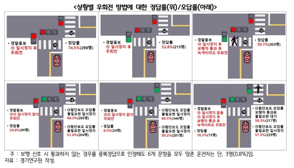 경기연구원은 2023년 12월 21일 수도권 시민 600명(운전자 400명, 보행자 200명)을 대상으로 우회전 통행방법 관련 인식조사를 실시한 ‘우회전, 돌아야 되나 말아야 되나?’ 보고서를 발간했다고 6일 밝혔다.