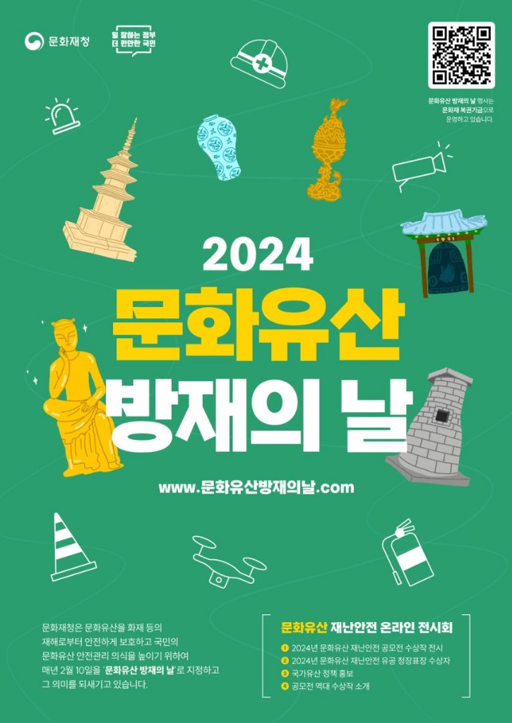 문화재청은 국가유산의 안전과 방재정책 구현을 위해 2023년 한 해 동안 적극적이고 창의적으로 노력한 기관 1곳과 개인 25명을 유공자로 선정하였으며, 지난해 11월 중순부터 12월까지 약 40일 동안 전 국민을 대상으로 실시한 ‘문화유산 재난안전 공모전’을 통해 총 176점의 출품작을 접수해 2개 분야(그림, 짧은 영상(쇼트폼))에 각각 6점씩 총 12점을 공모전 수상작으로 선정하였다.