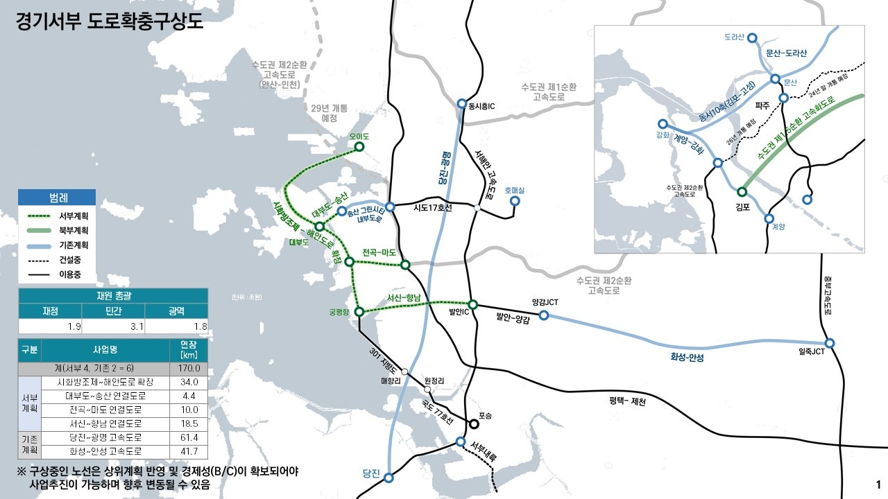 실제로 서부권역 경기서부권 7개 시의 도로연장비율(1㎢당 도로길이(㎞))은 2.61로 경부축(5.12)의 51% 수준에 불과하며 특히 화성·평택·안성·김포·파주 5개 시는 24%로 발전과 성장 저해 요인으로 꼽히고 있다.