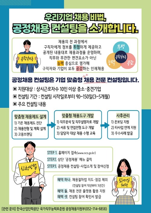 공정채용 컨설팅은 기업이 직무에 적합한 능력있는 인재를 투명하고 효과적으로 채용할 수 있도록 돕는 컨설팅이다. 채용직무 분석, 채용공고 작성, 선발기준·면접질문 마련, 고용브랜딩 구축, 온보딩 설계 등 채용단계별로 지원한다.