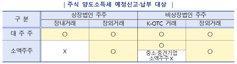 국세청은 이날부터 신고 편의를 위해 예정 신고 대상자 중 상장법인 대주주와 한국장외시장에서 거래한 비상장법인 주주(중소·중견기업 소액주주 제외) 등에게 주식 양도소득세 예정신고 안내문을 발송한다.