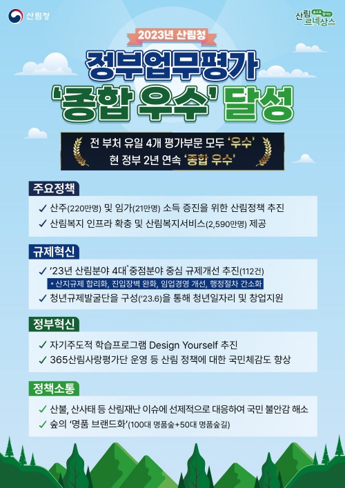 2023년 정부업무 평가에서는 선제적으로 산불, 산사태 등의 산림재난 대응을 강화하여 국민 안전 확보에 기여했고, 산주(220만명) 및 임가(21만명)의 소득증진을 위해 112건의 규제를 개선하였으며, 지역사회 발전과 탄소중립· 기후위기 대응을 위한 글로벌 산림협력 성과 등을 인정받아 정부업무평가에서 좋은 성과를 낸 것으로 분석된다.