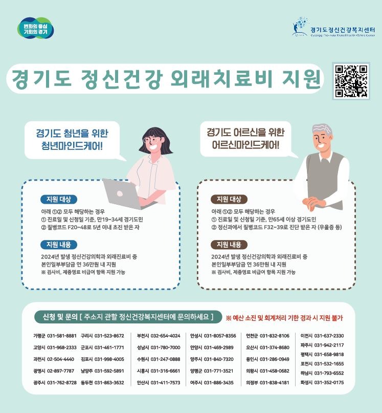경기도가 정신건강 취약계층인 청년과 노인을 대상으로 정신질환 외래 진료비를 지급하는 ‘마인드케어’ 사업을 올해도 지속한다며 도민들의 관심을 당부했다.