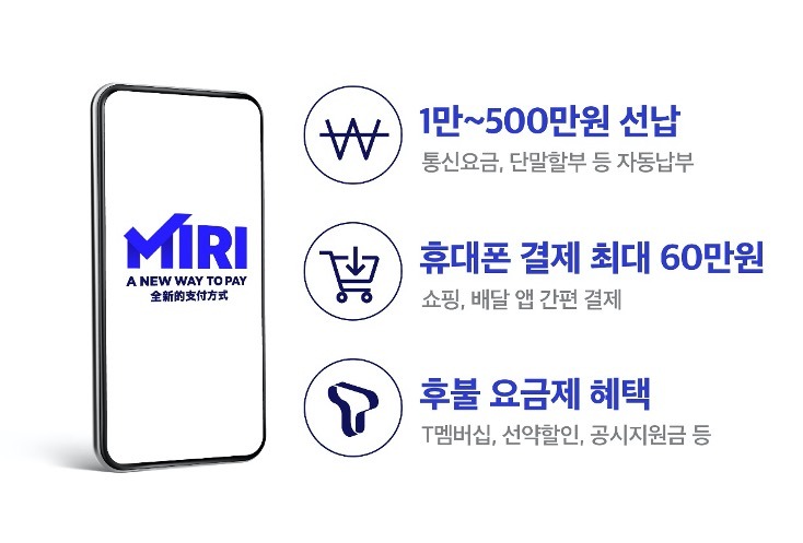 ‘미리’는 월 정액 요금을 미리 납부할 수 있는 선불 서비스와 선택약정할인, 공시지원금, 멤버십할인 등 통신 혜택을 제공하는 후불 서비스의 장점을 한데 모은 ‘선납(Upfront)’ 서비스다. 미리 충전해 둔 금액을 소액결제, 콘텐츠 이용료 등에도 자유롭게 쓸 수 있어 기존의 선불 서비스와는 차이가 있다.