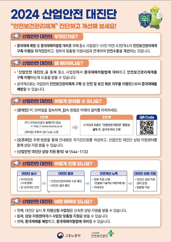 고용노동부와 한국산업안전보건공단은 「산업안전 대진단」을 실시한 이후 첫 현장점검의 날을 맞이하여 5인 이상 50인 미만 건설·제조·물류업을 대상으로 산업안전 대진단을 안내하고, 안전보건 현황을 점검했다.