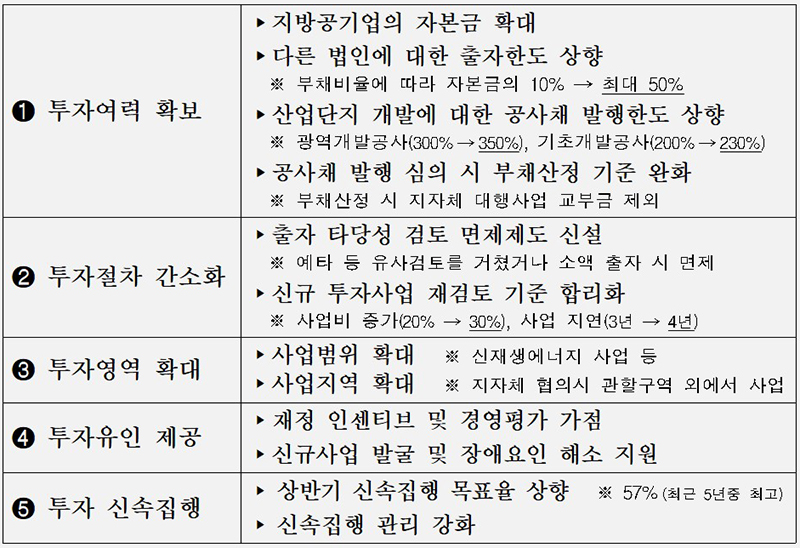 또한 산업단지 개발에 대한 공사채 발행한도를 상향해 투자여력을 확보하고, 투자절차 간소화를 위해 출자 타당성 검토 면제제도를 신설한다.