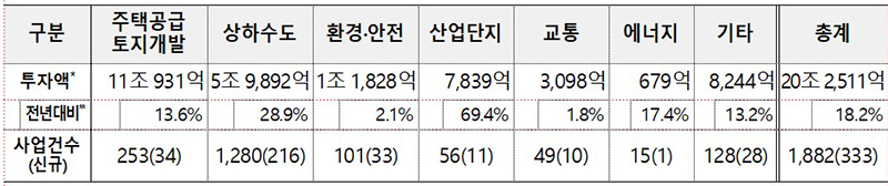 한편 올해 지방공기업은 주택공급·토지개발, 노후시설 정비, 산업단지 조성 등의 분야를 중심으로 20조 2511억 원을 투자한다. 지난해 말 발표된 17조5000억원의 초기 예산 대비 3조1000억원(18.2%) 증가했다.