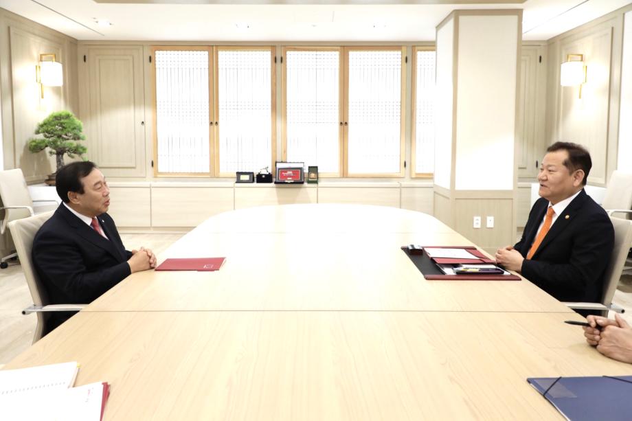 최민호 세종특별자치시장이 7일 세종정부청사에서 이상민 행정안전부 장관을 만나 행정수도 세종 완성을 위한 정부 차원의 적극적인 관심과 지원을 요청했다.