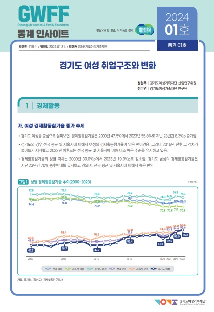경기도여성가족재단이 경기도 관련 및 경기도민 삶에 영향을 미치는 여성가족분야 통계자료를 분석, 정책적 함의를 모색하는 연구보고서 ‘GWFF 통계 인사이트’ 창간호를 발간했다고 8일 밝혔다.