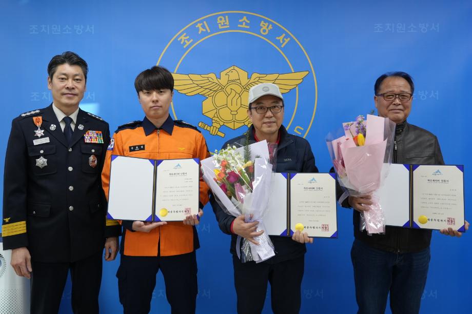 조치원소방서가 지난 7일 심정지로 쓰러진 시민을 살리는데 기여한 시민 김선일(67) 씨와 김용준(67) 씨에게 ‘시민 하트세이버’ 인증서를 수여했다.