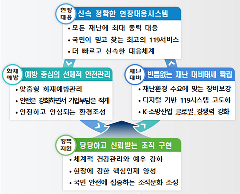 이에 ▲신속 정확한 현장대응시스템 구축 ▲예방 중심의 선제적 안전관리 ▲빈틈없는 재난 대비태세 확립 ▲당당하고 신뢰받는 조직 구현 등 4대 전략을 중심으로 12개 중점과제를 추진한다.