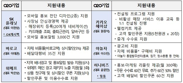 이에 중기부는 소상공인의 온·오프라인 연결(O2O) 플랫폼 입점의 부담을 덜어주기 위해 모바일 홍보와 마케팅 리플릿 제작, 컨설팅 프로그램 등을 지원하기로 하고 소상공인의 온·오프라인 연결(O2O) 서비스 활용도를 높일 수 있게 분야별로 우수한 민간 온·오프라인 연결(O2O) 플랫폼 기업을 선정했다.