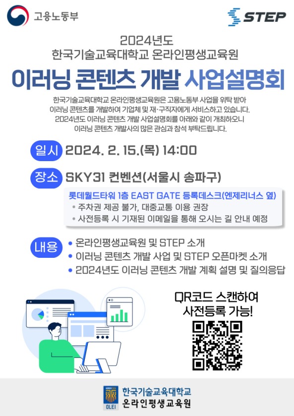 한국기술교육대학교 온라인평생교육원은 2월 15일(목) 올해 개발 예정인 320개의 기술·공학 및 디지털 신기술 온라인 콘텐츠 제작에 참여할 교육훈련 개발사를 대상으로 ‘2024년도 스텝(STEP) 콘텐츠 개발 사업설명회’를 개최한다.