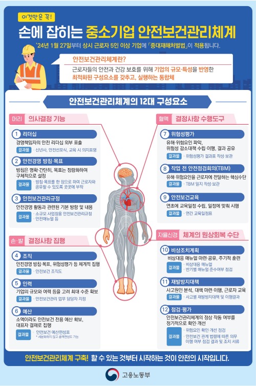 1월 27일부터 50인 미만 기업에도 중대재해처벌법이 확대 적용되는 가운데 법령에서 요구하는 안전보건관리체계를 더욱 쉽게 이해할 수 있는 동영상 설명자료가 유튜브에서 제공된다. 고용노동부(장관 이정식)는 ‘이것만은 꼭! 손에 잡히는 중소기업 안전보건관리체계 구축’ 영상 자료를 유튜브 등에 게시했다고 밝혔다.