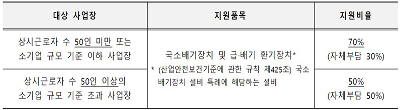 지원 품목은 급성중독 예방을 위한 화학물질 취급사업장의 국소배기장치와 급·배기 환기장치뿐만 아니라 조리시설용 환기장치까지도 포함한다.