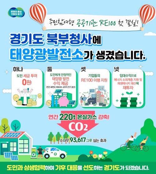 경기도는 북부청사 본관과 별관 옥상, 보건환경연구동 옥상, 관용차량 주차장에 360kW 규모의 태양광 발전시설을 설치하면서 경기도 RE100정책에 대한 도민 공감대 형성을 위해 도민 참여형 사업으로 진행됐다.