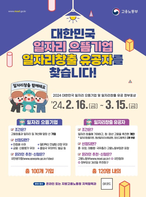 고용노동부(장관 이정식)는 올해 「대한민국 일자리 으뜸기업」과 「일자리창출 유공 정부포상」 선정 계획을 공고하고, 2.16.(금)부터 3.15.(금)까지 신청서 및 추천서를 접수한다고 밝혔다.