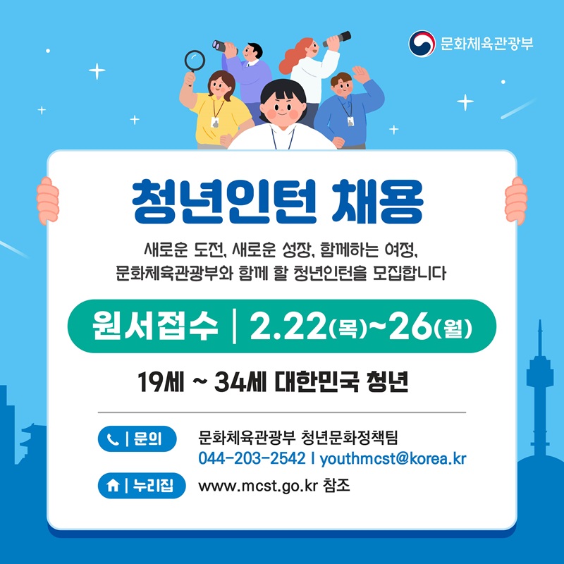 문화체육관광부가 청년인턴을 지난해보다 3배 늘려 상·하반기 두 차례에 걸쳐 채용한다.