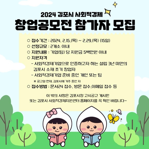 김포시가 취약계층의 일자리 창출, 사회서비스 제공 등의 사회적 가치에 중심을 둔 사회적경제기업을 발굴·육성하기 위한 '2024 사회적경제 창업 공모전'을 개최한다.