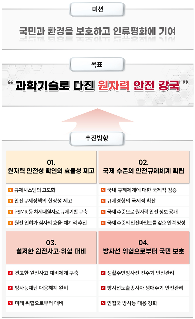 원안위는 국가 원자력 정책과 방사선 이용 확대 등에 따른 전방위적인 원자력 안전관리 수요 증가에 대해 효율적·체계적으로 대응할 수 있도록 ‘과학기술로 다진 원자력 안전 강국’이라는 목표를 수립했다.