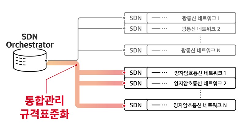 양자암호통신 네트워크는 광통신 네트워크와 병렬로 구축되기 때문에 통신사는 두 네트워크를 통합적으로 관리하는 것이 필수적이다. 이번 과제는 양자암호통신을 제어하는 소프트웨어 정의 네트워크(SDN)를 통신사의 전체 네트워크 통합 관리에 포함시키는 인터페이스(SDN Orchestration Interface) 표준을 개발하는 것이다(표준번호:GS/QKD-018 OrchIntSDN).